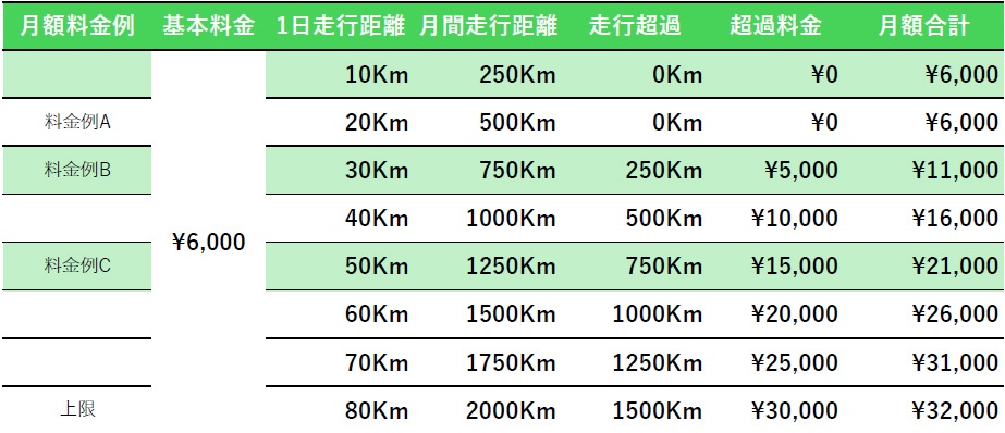 ※月間走行距離が500Kmを超えた場合1Km毎に20円が加算される料金プランになりますので下記の料金詳細をご参考ください。